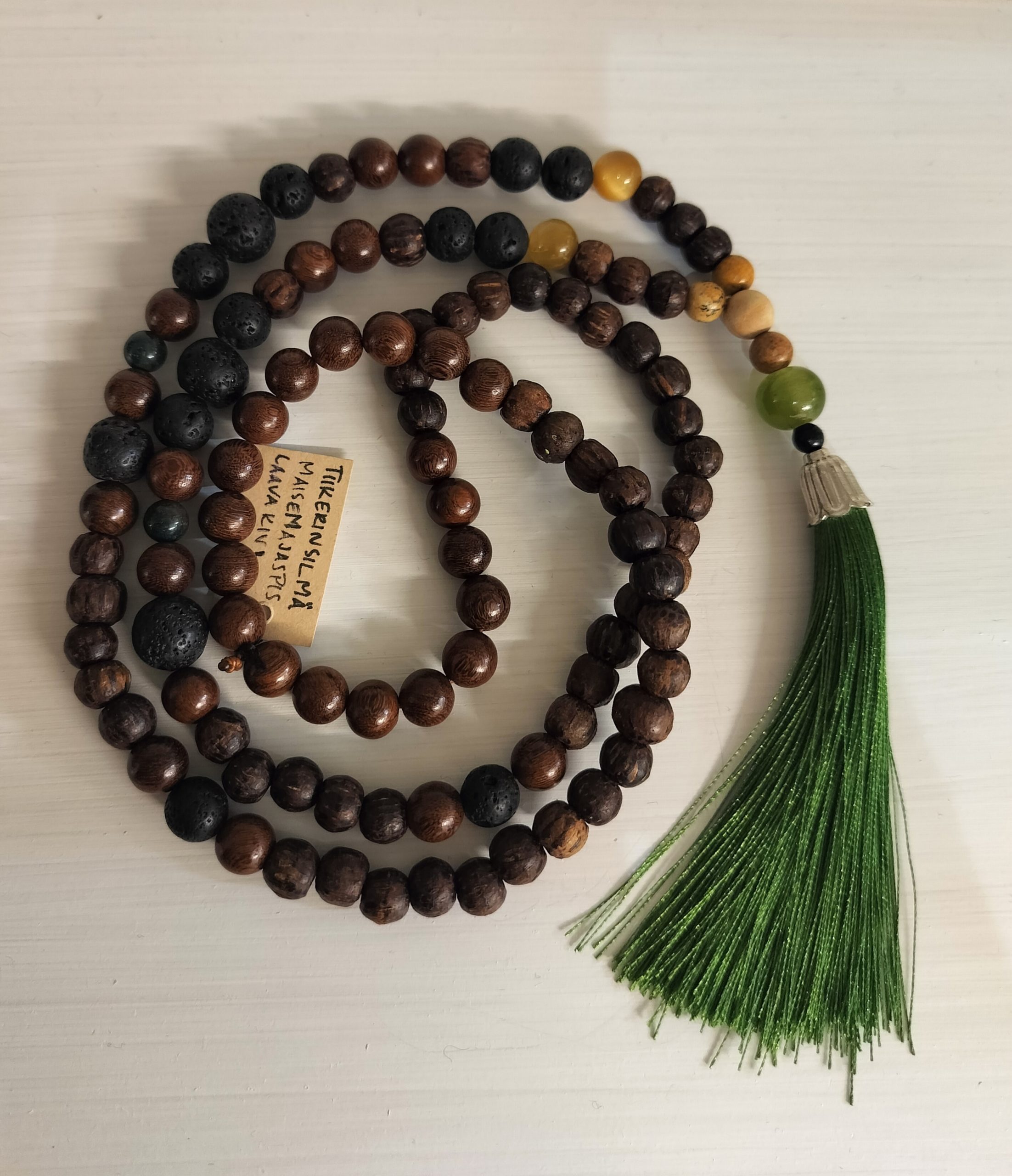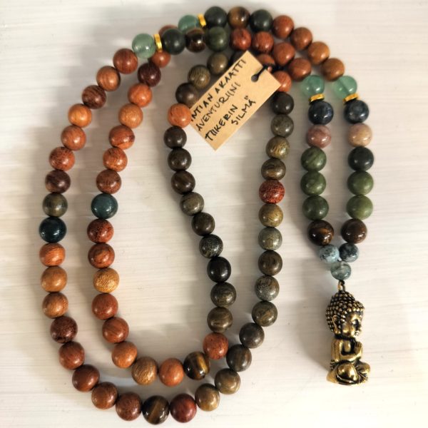 Puuhelmi kaulakoru jossa kivinä tiikerinsilmä, maisema jaspis, laavakivi.