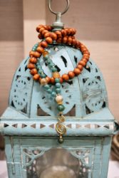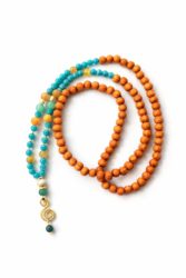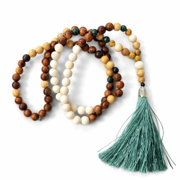 Puuhelmi kaulakoru jossa kivihelmiä ja intialaisia lasihelmiä. Riipus osa messinkiä.