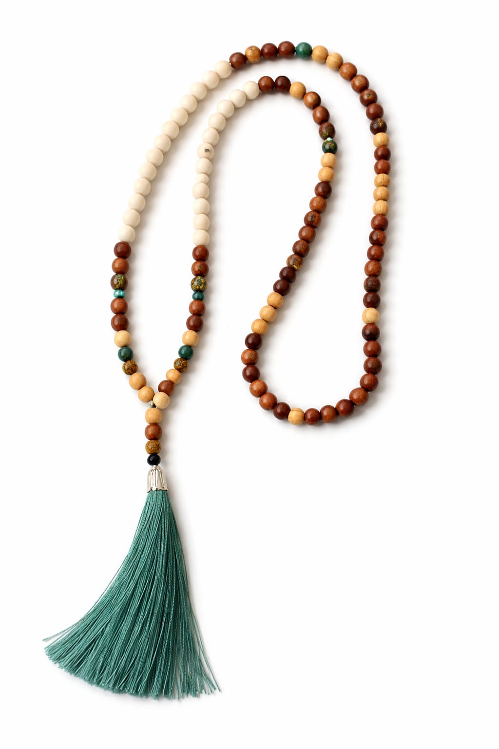 Puuhelmi kaulakoru jossa kivinä intian akaatti, maisema jaspis ja fossiilikivi